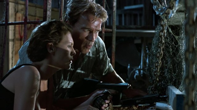 Arnold Schwarzenegger’s character, Harry Tasker, is a spy who masquerades as a computer salesman. His wife Helen (Jamie Lee Curtis) doesn’t have a clue what her husband really does for a living, but she longs for excitement in her dull life. Meanwhile their teenage daughter thinks her father’s a massive tool because, outwardly, he is. Why a boring white collar worker would have a bodybuilder’s body isn’t important. No one in the movie bothers to notice.