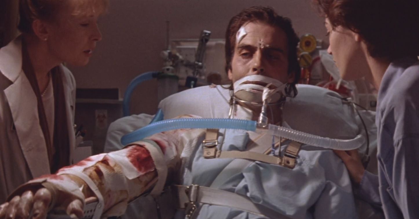 After Fahey begins having nightmares which he believes are a direct result of the transplant, he goes to the police station and has his new fingerprints taken. It turns out the hand belonged to a recently executed death row inmate who murdered over thirty people with his bare hands. When Fahey fails to get answers from the doctor who did this to him, he seeks out others who got the killer’s parts. One of the other beneficiaries is played by Brad Dourif, who’s just as compelling as Fahey. In fact, the entire cast is a cut above most horror movies, which is one of the reasons it’s so damn good.