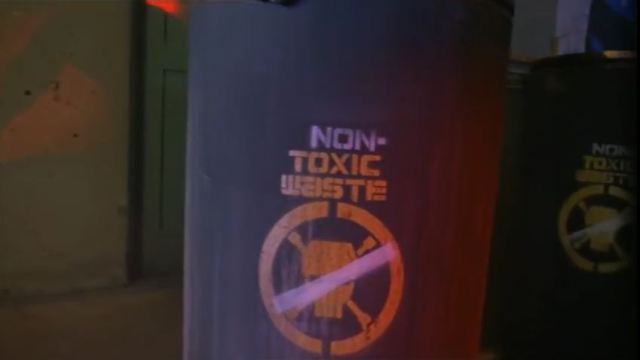 So it turns out Burke wants to run the family out of the house because he’s promised the land to a mobster who deals in toxic waste disposal. (It was the 90s… toxic waste was a hot topic in both children’s entertainment and adults’.) One minute you’re watching a low-key horror movie, the next you’re watching Burke and his cartoonish goons make their way through some kind of underground factory in which employees fill 50-gallon drums with toxic sludge, then amend the TOXIC WASTE labels to read NON-TOXIC WASTE. It seems it would have been easier just to get barrels that didn’t say TOXIC WASTE in the first place, but I digress.