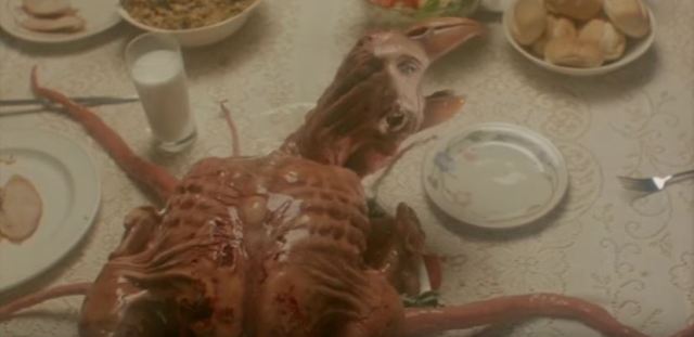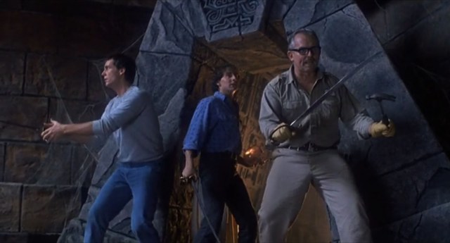 Gross and Stark dig through a stash of ancient documents and discover the crystal skull was buried with one of Gross’s ancestors. Dollar signs glimmering in their eyes, the boys dig up the grave only to discover Gross’s great-great grandfather (Royal Dano) is un-dead. I would say the hi-jinks which ensue were obviously inspired by Weekend at Bernie’s, but this movie preceded that one by almost two years. It’s basic 80s comedy (along the lines of Mannequin), which is somehow elevated by its lite themes of horror. Later, the movie will add a prehistoric bird and some kind of puppy/centipede creature to the cast, and the animatronics are charming as all hell.