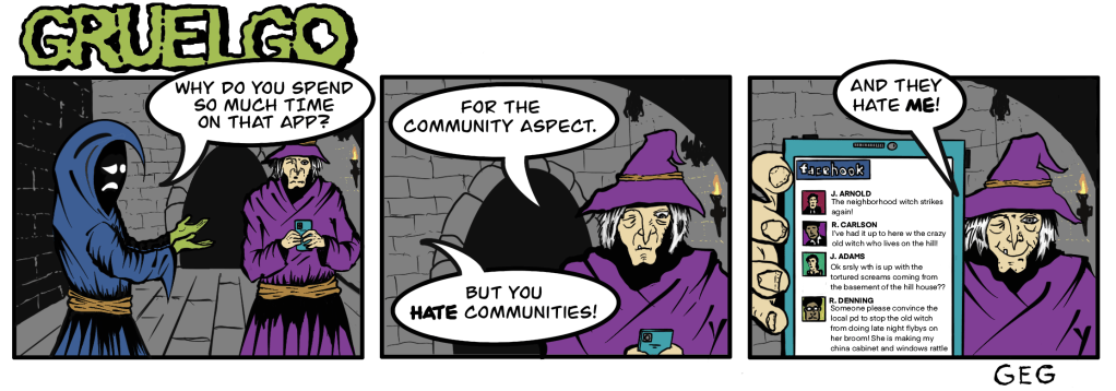 Beta readers (aka my girlfriend) asked me if Claude is Gruelgo’s son. The answer is: Does Claude even really exist? Who can say for sure who is eating all of Gruelgo’s food and leaving the toilet seat up? Maybe Claude is just a figment of Gruelgo’s imagination. Perhaps Claude is the product of Birgitta meddling in spooky-wooky supernatural stuff. Or maybe I just never thought that far ahead before I put a dumb gag in my silly comic strip!