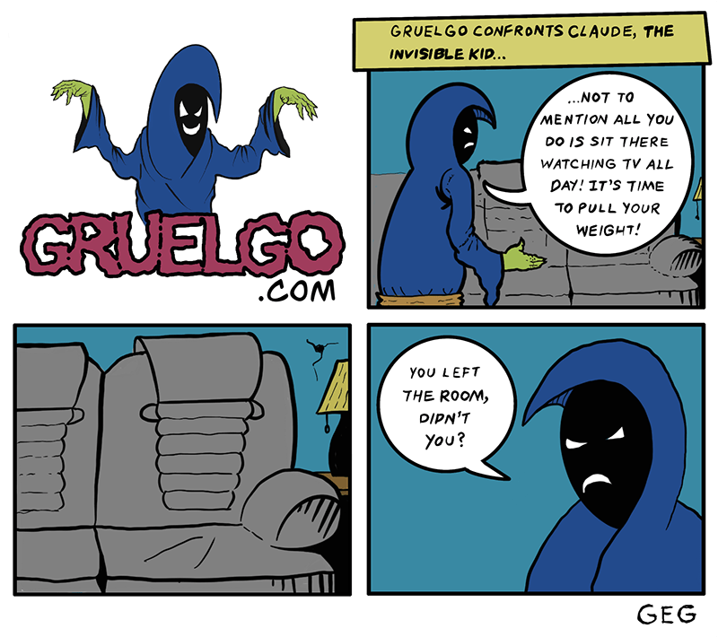 Beta readers (aka my girlfriend) asked me if Claude is Gruelgo’s son. The answer is: Does Claude even really exist? Who can say for sure who is eating all of Gruelgo’s food and leaving the toilet seat up? Maybe Claude is just a figment of Gruelgo’s imagination. Perhaps Claude is the product of Birgitta meddling in spooky-wooky supernatural stuff. Or maybe I just never thought that far ahead before I put a dumb gag in my silly comic strip!