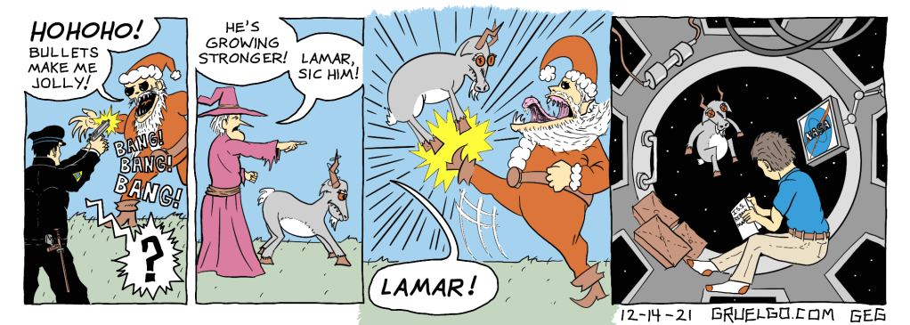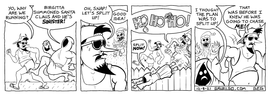 My favorite thing about this one is that Diabro just seems like he’s down for anything… “Hey, Gruelgo’s running! I’ll run, too!” Expect to see another one of these Christmas-related strips by the end of the week. Operative word being “expect.” Who knows if I’ll actually get around to it! (I’ve written like a dozen of ’em, so….)