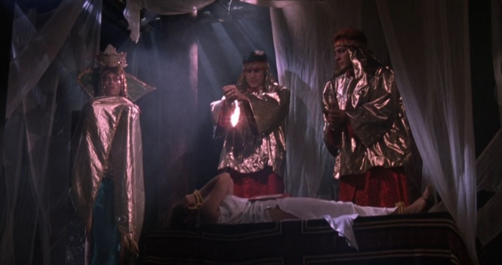 The cannibals are dimwitted brothers, devoted to their cultist uncle who is a talking brain in a jar. The brain will walk them through the complicated series of steps required to resurrect Sheetar, an ancient goddess. You may think the homicide detectives who are hot on the cannibals’ trail will stop the ritual from taking place, preventing the movie from showing the good stuff. You would be wrong. The movie culminates in an orgy of violence that has the detectives firing blindly into a crowd of people, perhaps killing more innocents than the cannibals ever did.